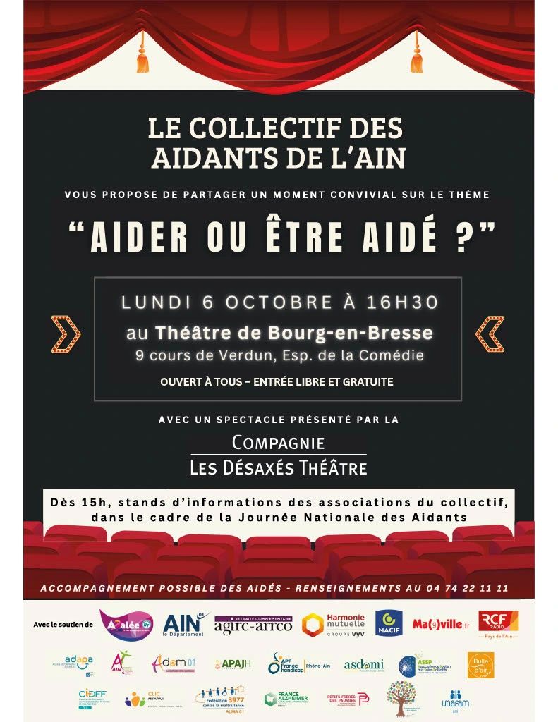 A 16h30, spectacle « Aider ou être aidé » – la compagnie les Désaxés Théâtre abordera avec réalisme, parfois avec humour, des petites histoires théâtrales sur le thème de « l’aidance » : coup de projecteur sur la vie quotidienne des aidants et des aidés !